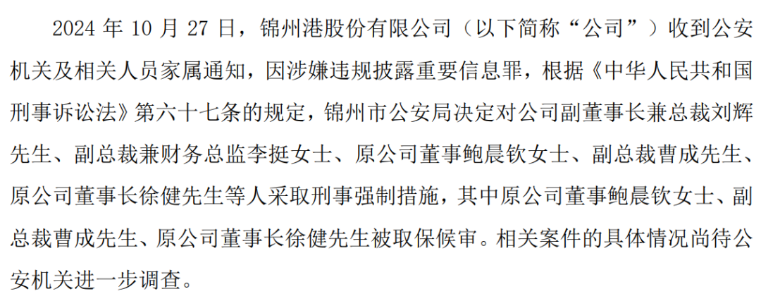 此外,锦州港时任副董事长、总经理刘辉、时任副总经理、财务总监李挺等高管已被采取刑事强制措施。